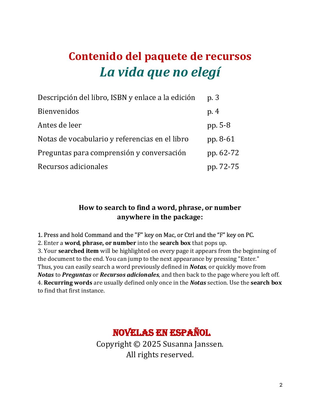 * Only the resource packages for the novels are sold on this site. Here is a link to the print edition of LA VIDA QUE NO ELEGÍ that corresponds to the resource package pages. To purchase a novel, please visit your favorite book seller. If you have any difficulties obtaining this novel, just contact me and I’ll be happy to help you source a copy.